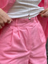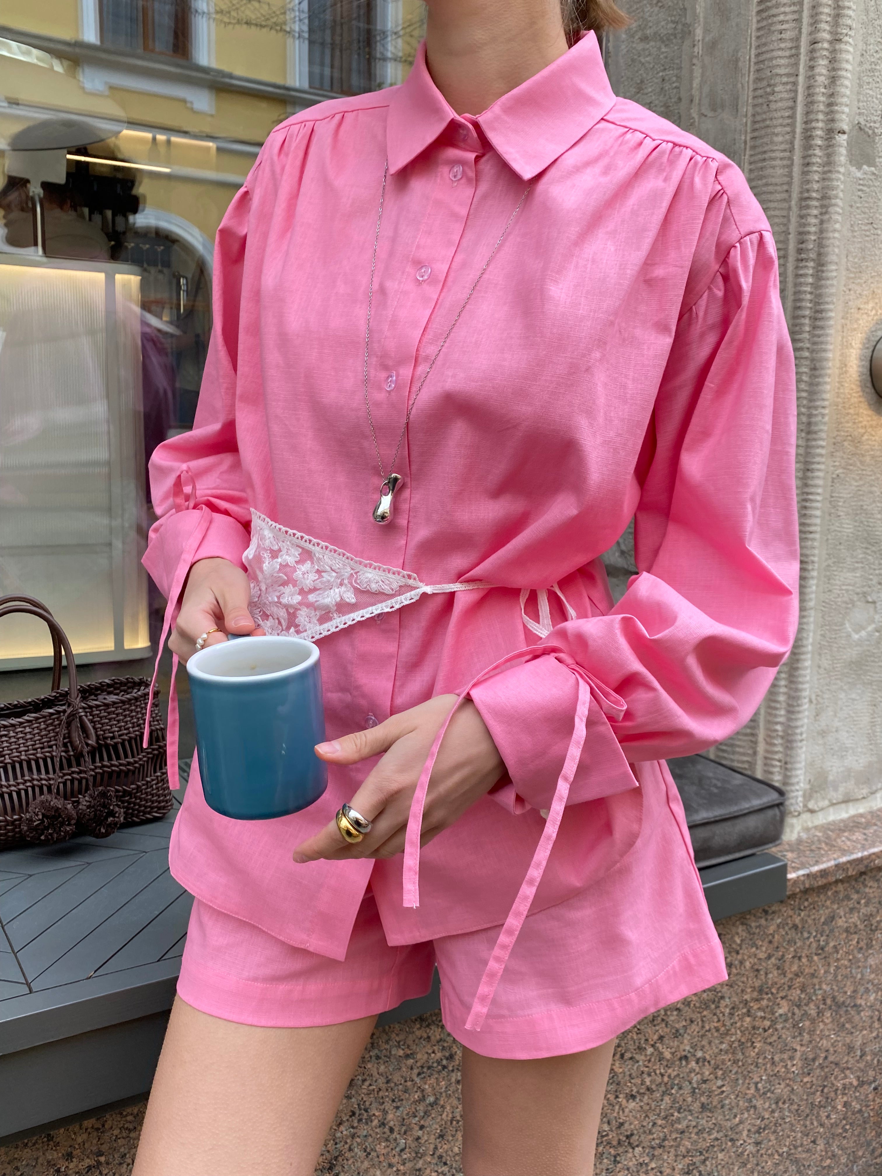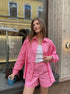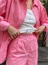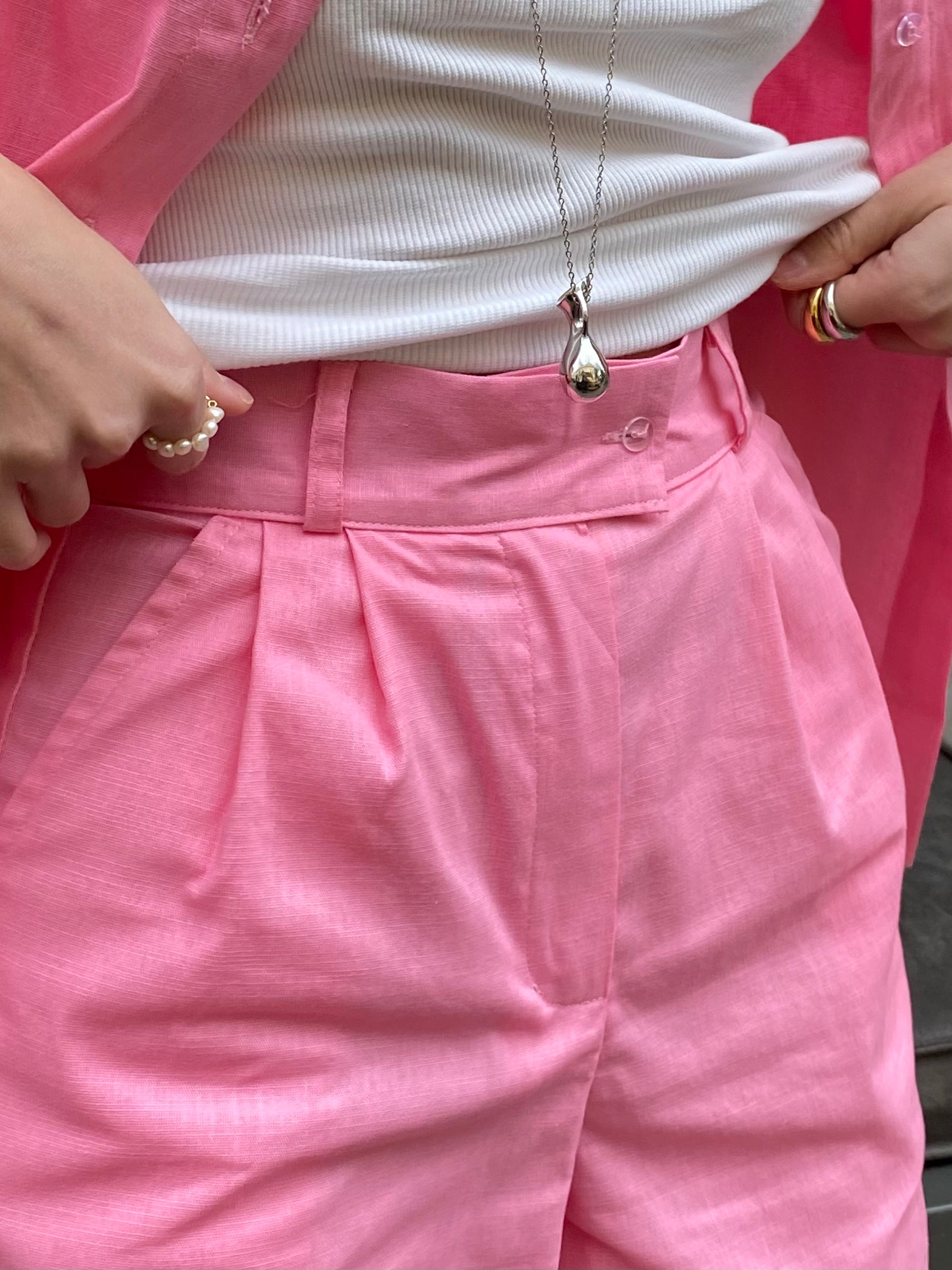 • Рожевий костюм – виготовлений з тканини зі складом 70% віскози, 25% льону та 5% спандексу для м'якості, еластичності та комфортного носіння.